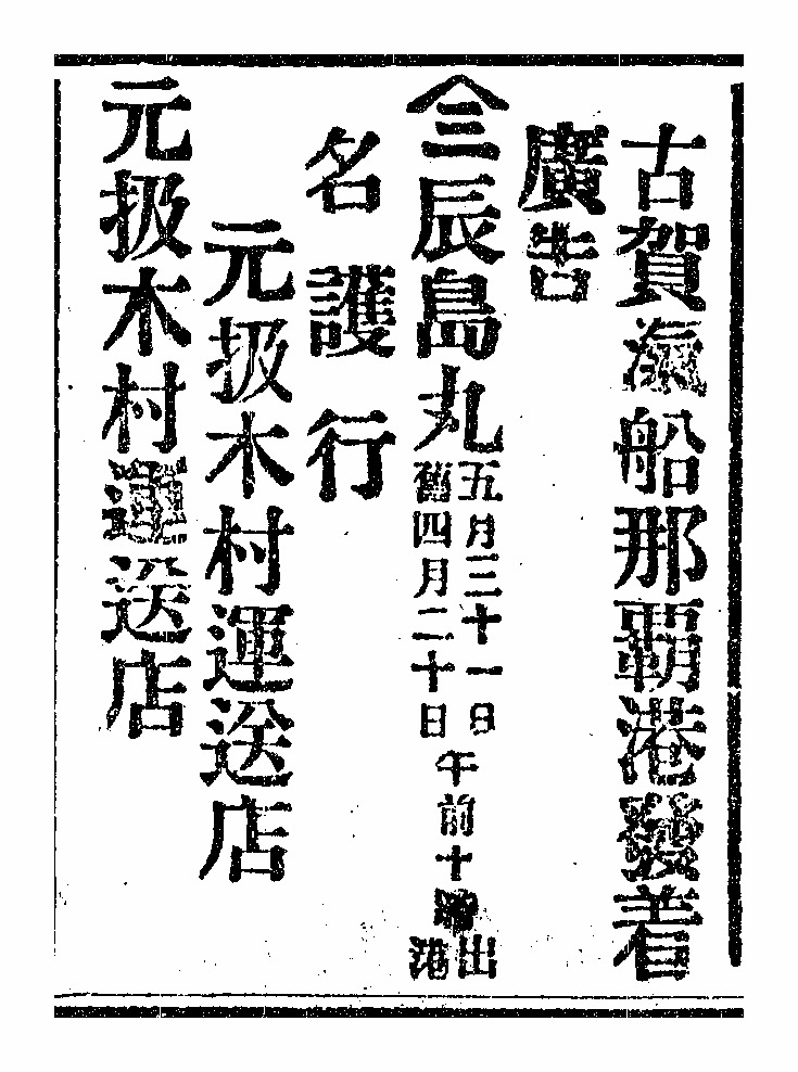 辰島丸 五月三十一日舊四月二十日午前十時出港