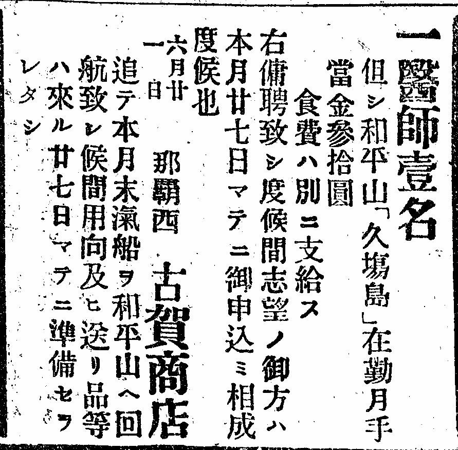 右傭聘致シ度候間志望ノ御方ハ本月廿七日マテニ御申込ミ相成度候也。