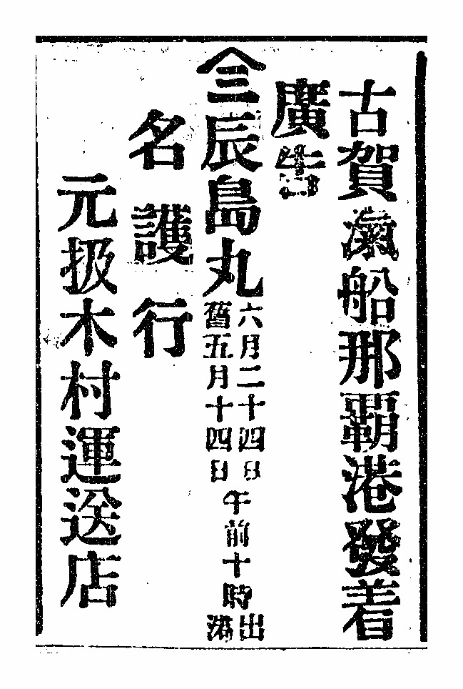 古賀滊船那覇港發着廣告辰島丸 六月二十四日舊五月十四日午前十時出港名護行元扱木村運送店